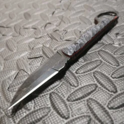 Every Tie-Breaker is crafted by Blake Sudo of Hammerhead Knife Works in Virginia, USA. The 80CRV2 premium steel blade is formed into a modified drop point that seamlessly blends sleek lines with chiseled and artistic forge marks. Each blade has a superior heat treat that ensures durability under use and is protected by a handsome Black Stonewash finish. The gunmetal gray scales are unique and beautifully stunning and accented with crimson liners.. Included is a quality kydex sheath with a HLR Discreet Gear Clip which allow for carry with or without a belt! A length of paracord for neck carry and horizontal belt adapter are also included to give you multiple carry options.
