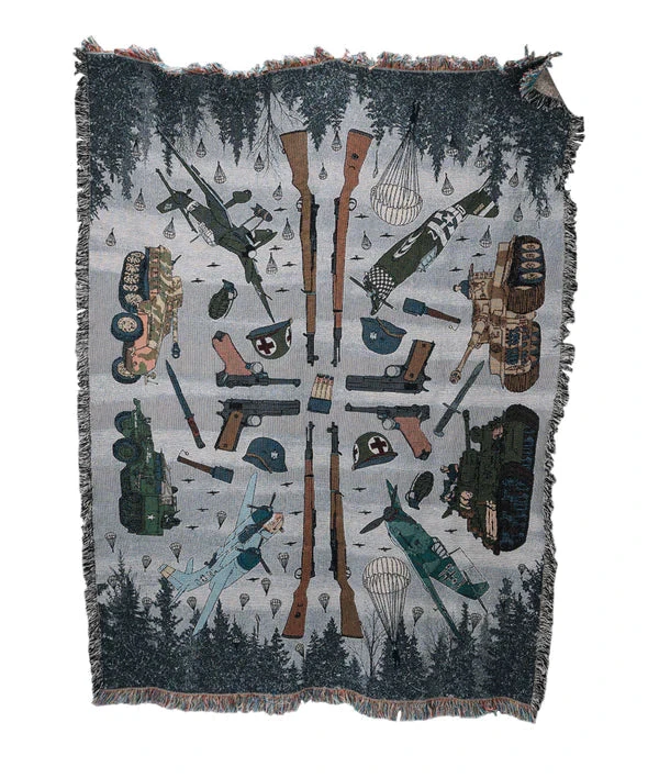 American craftsmanship and European military history come together in this woven throw blanket. Each blanket showcases iconic World War II tactical weapons, military vehicles, and firearms. Wrap yourself in nostalgia and heritage with this unique tribute to historic European warfare.