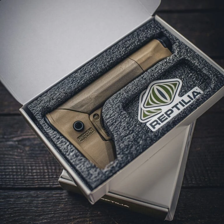 Introducing the RECC·E™ Carbine Stock by Reptilia®! After more than two years of development and testing, Reptilia is proud to announce the RECC·E Stock for AR10/SR25 pattern rifles. Designed at the request of a military end user, the RECC·E Stock features a constant cheek weld, switchable QD sling attachment points, rubber buttpad, and a modular design that allows usage of a standard AR15 carbine buffer system, or A5/SR25 carbine buffer system by replacing the receiver extension (buffer tube) and forward portion of the stock. Weighing only 12.8 ounces including the proprietary SR-25/A5-length receiver extension, the RECC·E stock is the ideal lightweight solution for the entire spectrum of AR-pattern guns from compact to precision.