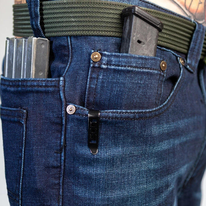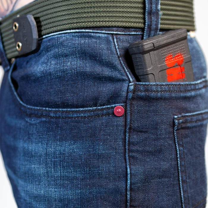 This jean has 7 pockets for magazines, EDC items, and other essential gear. There are 2 hand pockets for keys, flashlight, and other items. 1 Coin pocket deep enough to accommodate a pistol mag or pocket knife, 2 back hidden back yolk pockets for AR-15 magazines or you can fit a small blowout kit or tourniquet. And finally 2 back pockets for a wallet. We constructed it with rivets in high tension areas, double needle stitching and bar-tacking all to reinforce the jeans for heavy use. We are confident that these jeans will become your favorite everyday pants.Â
