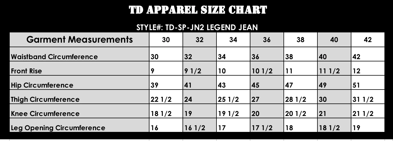 The MAN, the MYTH, the LEGEND Jean. Why another jean to the already strong TD Apparel denim line up? We wanted to build a more streamlined value based pant that still has plenty of function for an active user. This jean is constructed of 12oz. stretch denim. The actual fabric specs are (92%Cotton, 6.5% Poly and 1.5% Spandex). This yarn combination gives optimum comfort, durability and stretch. We also developed a vintage wash technique for both the indigo and black colorways.Â