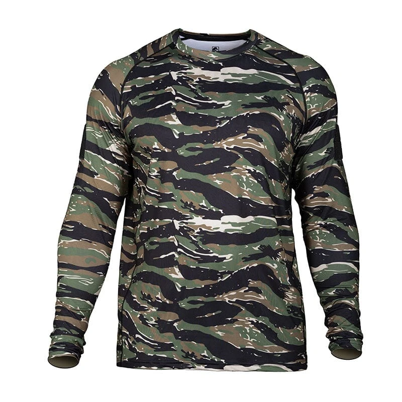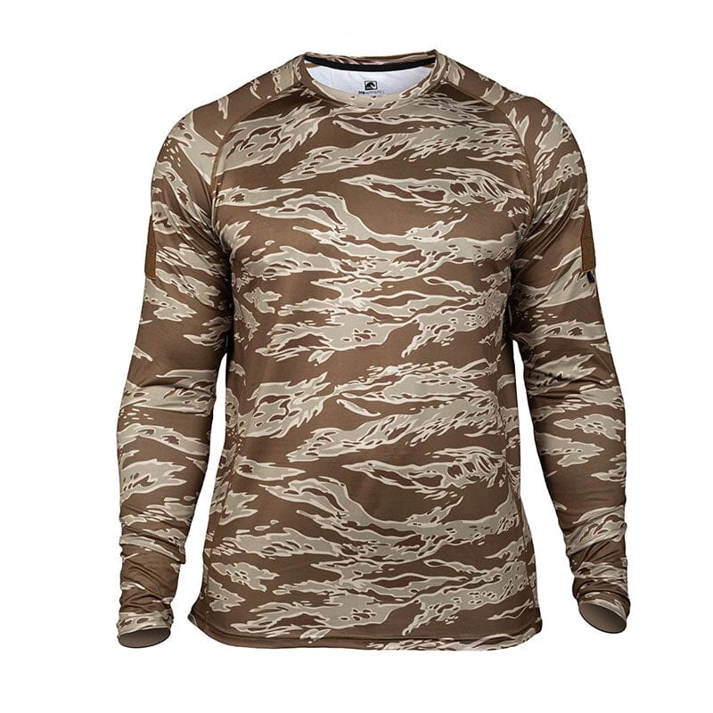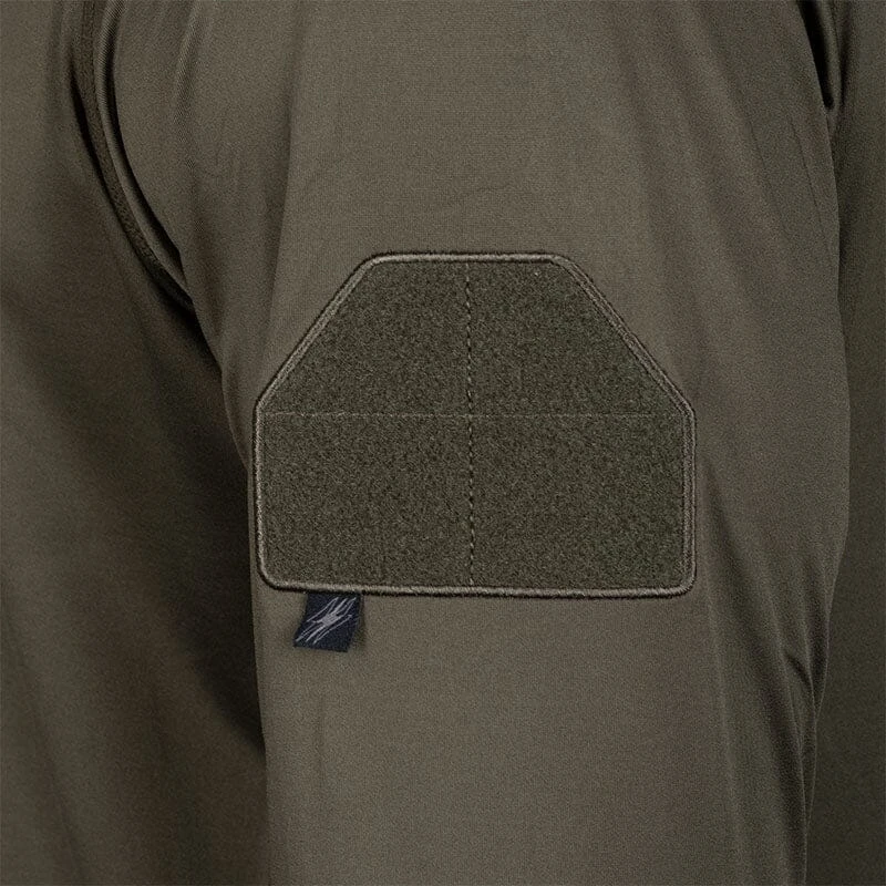 The Shooter Performance Shirt revamped! This long sleeved shirt is built for action with 4-way stretch, in a moisture-wicking fabric to keep you cool and dry. Wrapped side panels and raglan sleeves allow flexibility of movement. We updated the collar to self-fabric and added a low-profile neck tape elastic to clean-finish the inside back neck. Screen-printed interior branding for comfort and updated exterior logos with our new graphic. Plus a loop sleeve patch on each bicep to show off your morale patches. Â