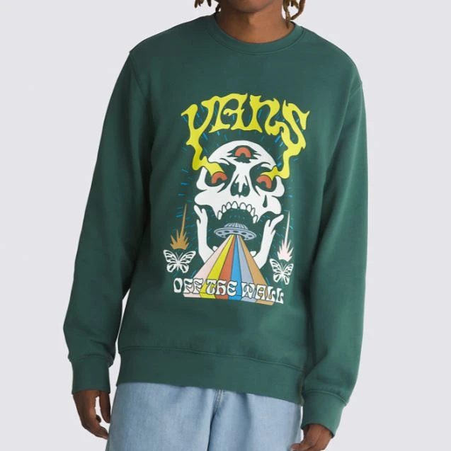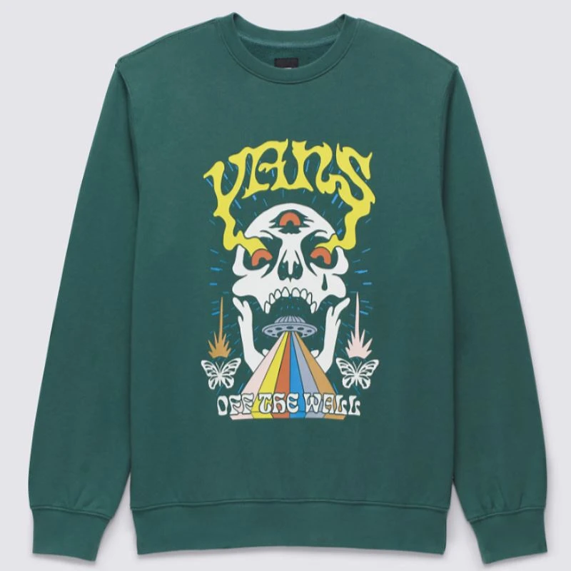The All Seeing Crew Sweatshirt is a crew neck sweatshirt made with a comfortable cotton-blend fleece and features the Vans logo and skull and rainbow, heavy metal inspired graphic on the front.